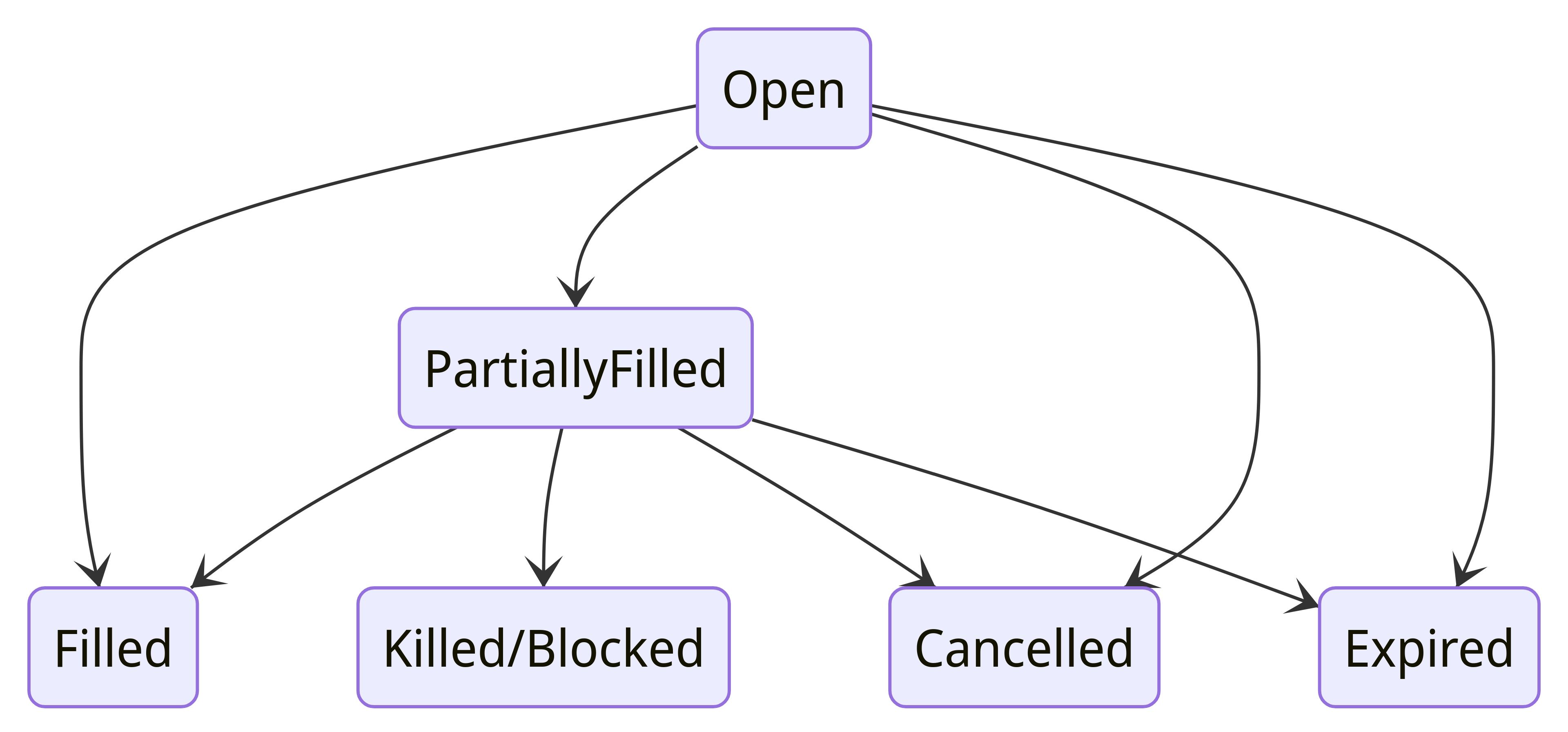 A unique aspect of our order lifecycle is the occurrence of combined states, particularly for orders that still need to be fully executed. These include states such as 'Partially Filled & Cancelled' or 'Partially Filled & Blocked', which serve as final designations for an order. Such combined states are crucial for understanding the nuanced outcomes of your trading actions, indicating that an order has been initiated but not completed due to specific conditions and, subsequently, the action is taken (canceled, blocked, etc.) as a resolution.